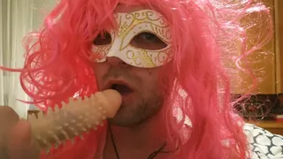 Jugando con un fake penis, fantasía de un travesti de satisfacer a un hunky