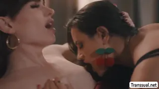 Gorgeous shemale and her busty friend are on the couch kissing each other.After that,smalltits TS lets her friend suck her hard shecock passionately.In return,she licks the ass and pussy of her friend before she fucks it so deep and hard.