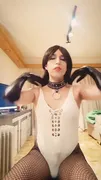 Sissy crossdresser in white swimsuit masturbates thinking about dominant males, wanting to get one or more to subdue her and expose her like a real sissy cocksucker. She is so excited thinking in that