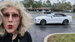 Mrs Samantha driving a white Ford Mustang Convertible through Florida. This day she is applying her makeup in a Jacksonville motel. before going to a shopping mall, with hurricane Nicole on the way.