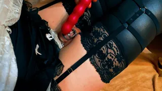 Lovely sissy in rosy maid sundress plays and pops on 50 cm butplug in v-card