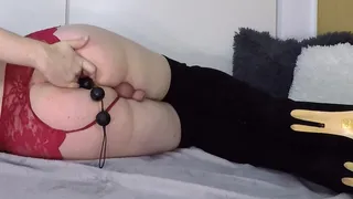 Transgender in high high-heeled shoes and undergarments does assfucking beads