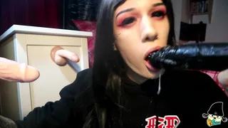 Goth Tgirl deep throats till she pops on the fucktoy and deep-throats all her spunk off it