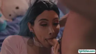 Horny Tgirl is on her bed sucking dildo.After that,she puts it inside her ass and next is,she calls her roommate and she lets him fuck her ass so hard.In return,she throats his big cock and lets him f